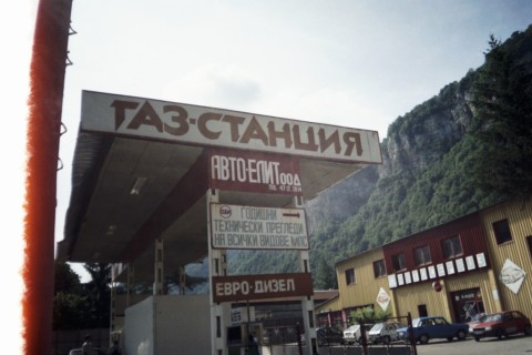 He directs me and sure enough I'm soon crossing an ancient one lane stone bridge - lots of Frogs in the water below - I thought the Yantra would be bigger though...maybe this is just a creek feeding into the Yantra? I see electric lights in the air ahead - maybe a bridge? Maybe a shipping facility? My eyes are tired and I don't exactly what I'm looking at. I pass through some industrial yards and start climbing. A "wild" dog snarls, but these "wild" dogs are no worse than the "domestic" dogs at home. At the top of this climb is an all night gas station, where all the employees and some of the customers end up gathering around to see the foreigner biking across the country in the middle of the night. They tell me there's hotels in V. Turnovo, but I explain I'm only passing through Draganovo (ДРАГаа on my way to Popovo (Паа and then I'll rest at Isperih before continuing. They fill my water bottle and I buy a road map and get directions. The explain to me that the town I'm asking about is really a village. A young man and his girlfriend dressed up for a night out have me follow their car to get me back on course. I get right behind them and wonder if they're trying to see how fast I can go. I'm having fun, hanging on, and trying to go as fast as I can while not hitting any Dupkas. After several turns that I'd have never found on my own, they point me off with instructions to continue some kilometers across and out of town, go under the overpass, turn right, then over the overpass toward the left.