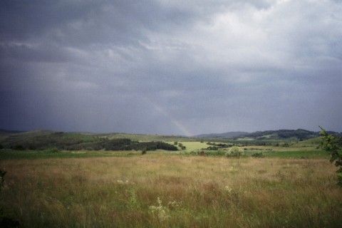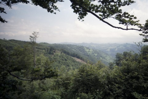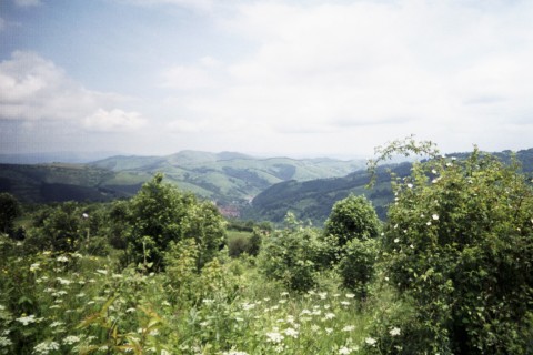 We get through the highest of the peaks and now we're in hilly green farm lands. I see more cars than I expected, but donkey-drawn carts are everywhere too. Some farmers (Gypsies?) put red tassels on the horse's forehead and most animals seem to be wearing bells.