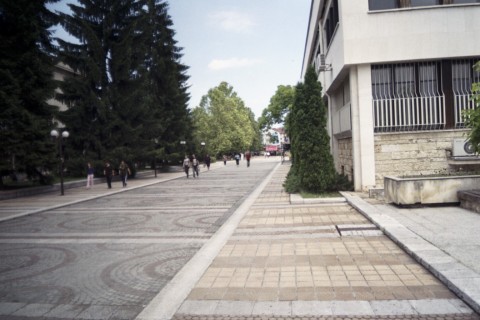 While relaxing, I look again at the cue sheet and discover I've misread it again - we've got 36 more km on this highway, not just two! Onward and eastward to the former capitol of Veliko Turnovo. I start to get anxious again as I'm thinking I should be nearing V. Turnovo, but there's still no sign. I'm thinking I must be only 10km or so away, yet I'm seeing signs saying there's an "OMV" petrol station 12km away. This can't be right, can it? Would they tell me I'm approaching a petrol station and make no mention of the large intervening city? It turns out fine - I get to the city without the signs, wander around a bit, ask directions for Hotel Travenitza ("ХаЕЛ ТРАВЕНИЦА") at a restaurant.