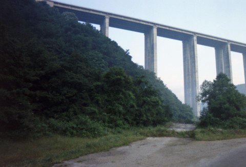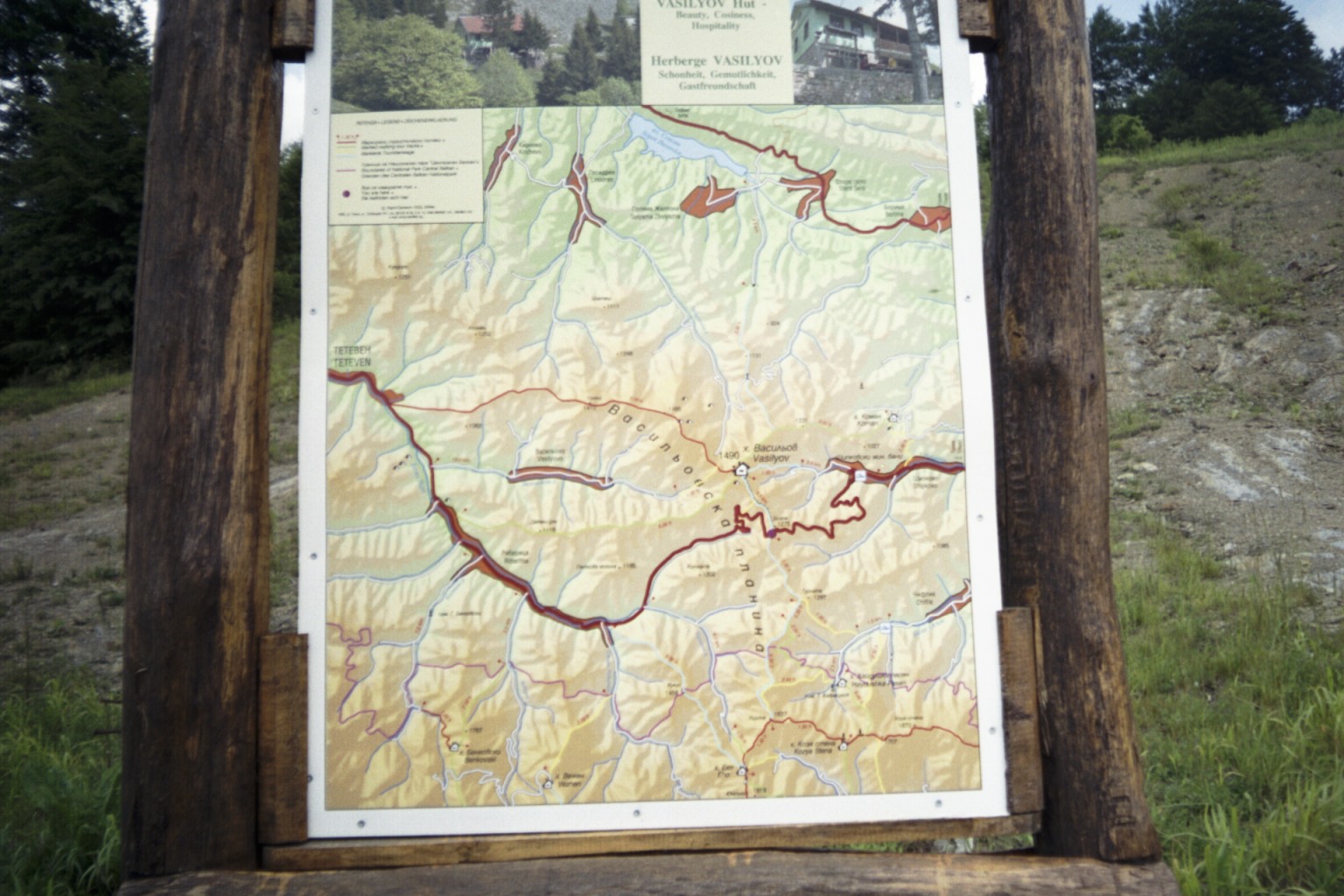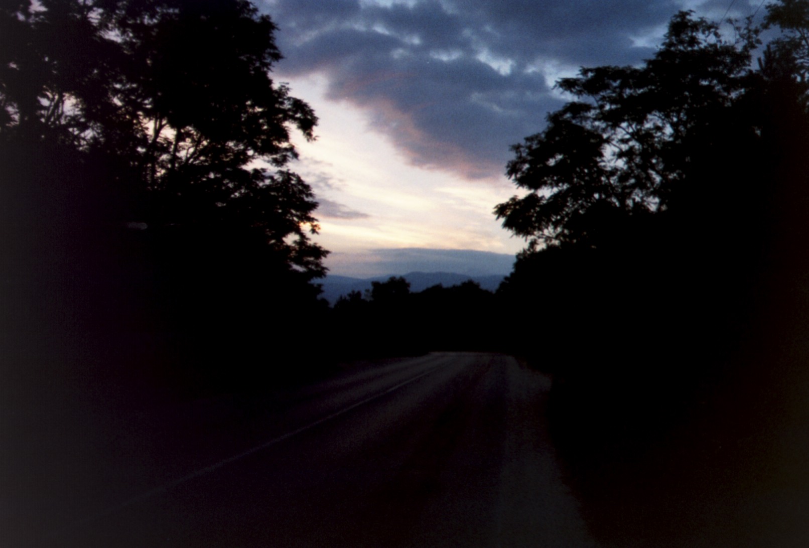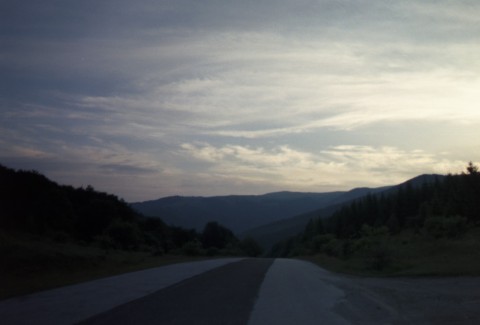 I come to a small town where I need to make a turn. It's way after midnight, but there's still pubs open with people sitting at tables in the cool open air. I see TV's with the football game. I pull into a closed but well-lit service station to look at the cue and map. A guy walks over form the pub to help me out. I'm not sure, but I think he may have offered me a place to sleep - I probably should've took him up on that. Now I'm off climbing toward those "Ethnic Turkish Villages" on page four - the ones I'd been looking for when I got my pages mixed up. It's getting late, it's dark, the road looks like a National Park Service road and the cue sheet says "Wild Animals". Wild Animals? Dogs? Wolves? Bear? I jump a little anytime I hear a rustle in the bushes but I see no animals. It seems like I pass several lakes, could I be going in circles? I hear lots of frogs - maybe Lazar is playing a joke on me - maybe the "Wild Animals" are wild frogs! Eventually, I feel I have to rest. I find another closed, but well-lit service station, lie down and close my eyes.