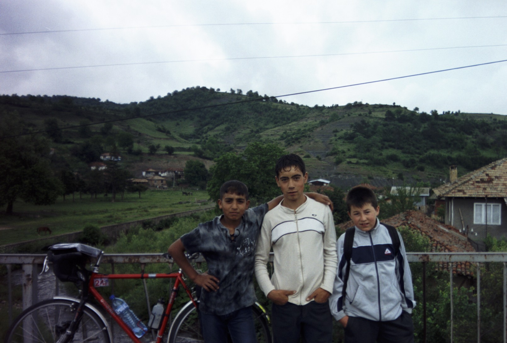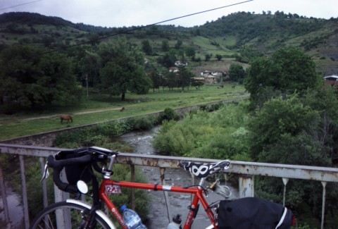 I come down a steep mountain road and fly into a town, but I have to stop because the view from the bridge over the rushing mountain stream is so beautiful it must be photographed. The village boys come running to see the stranger in town. "Ratko" is talkative and friendly - I wish I had those North Carolina postcards to give him, but I think I left them in my drop bag. I wonder if I can mail him something "General Delivery". I pull out my cue sheets to show them what we're up to, but just then a gust of wind slips the last one from my hand it goes sailing through the air down to the river far below. Uh-oh. Good thing that wasn't today's sheet - I'll have to figure out what to do tomorrow.