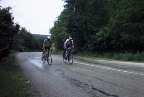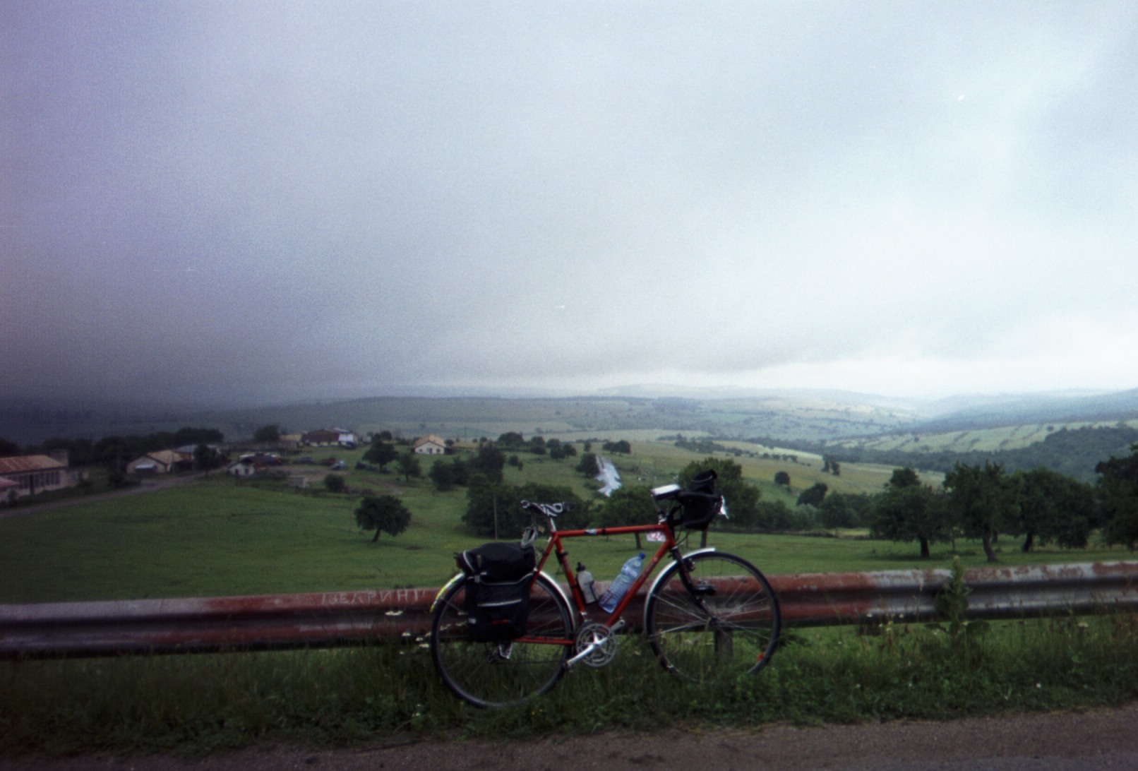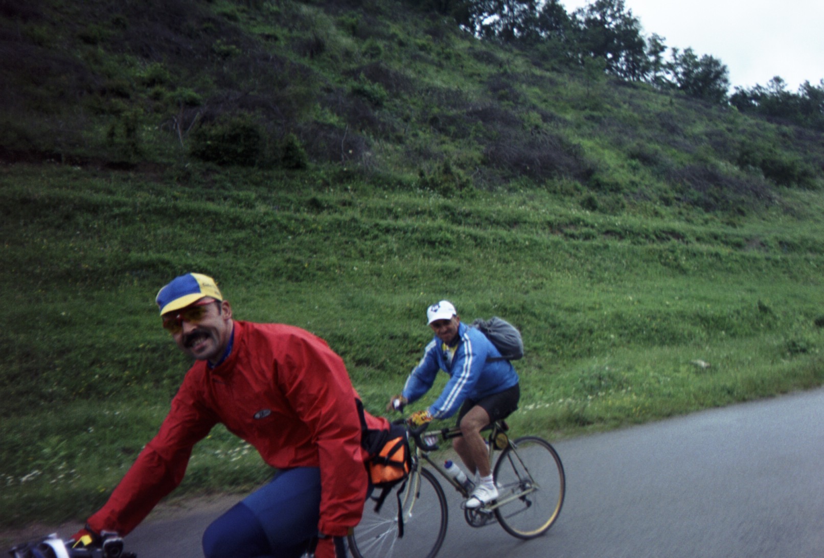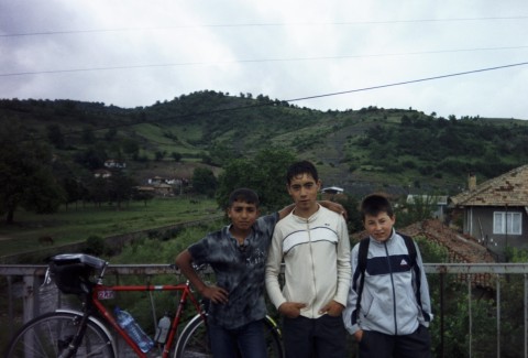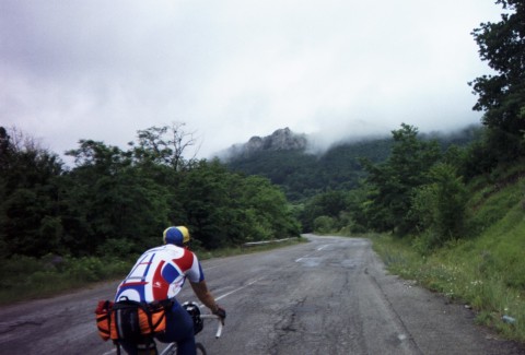 Gyrov and the Bulgarian Adrian come flying down the hill that brought me into town and the three of us set off. We're the Three Amigos for the rest of today anyway. Got some big climbs between here and Sliven and we stick together most of the way. Gyrov tells me about a National Folk Music School in the next village. It seems like a lively place, there's a couple of combines coming up the road through town and throngs of people gathered at the roadside restaurants.