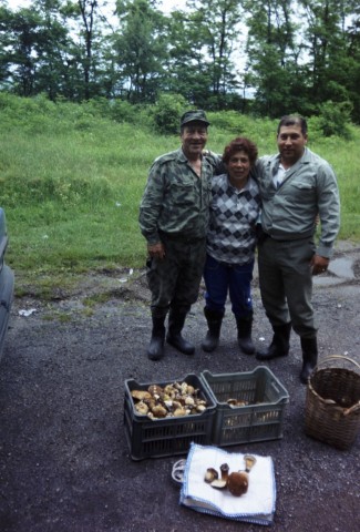 Up into another mountain and we stop at a roadside water pipe to refill. As we head out a pickup truck we three locals has just pulled in and I see they've got a big basket full of what looks like Portabello mushrooms. I go back to photograph them with their mushrooms. They're quite pleased to have their picture taking and post proudly together with the 'shrooms. Then the lady insists that I take a bag of the strawberries they've been picking.