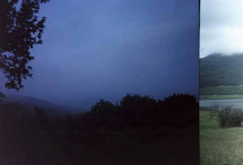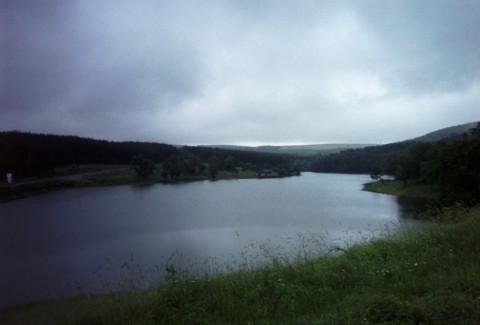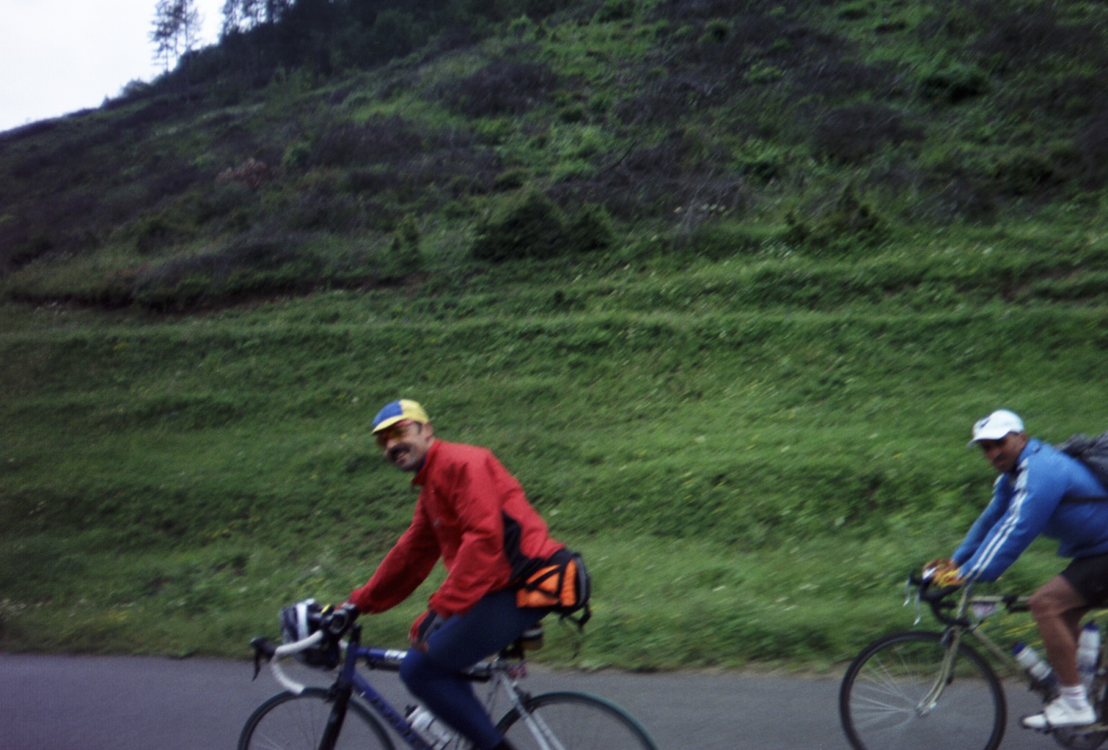 It's Saturday now - possibility of thunderstorms in the forecast, but it's been days since I've seen a forecast. It's overcast, cool and the fog gets pretty thick in some of these hills. Stop at a gas station for water and juice and answer the attendants questions about what we're doing - "Oh yeah, we DID see two others this morning" Richard and Lazar maybe? But I think Richard went through last night. Climb back into the mountains. I'm thinking this is like the Appalachians, only without rednecks selling fake hillbilly trinkets and Elvis rugs by the side of the road. I do see one man selling peaches by the roadside - he's made himself an interesting small shelter of logs with a thatched roof - just big enough to give him a place to sit and keep the sun off.