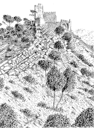 I didn't see another soul on bike car or foot after exiting the main road. Ancient low stone terraces created slight ledges in the hills here where those bluish-green leaved trees (olives?) were growing far below the castle. Eventually it dawned on me that this road ALSO led to the castle I saw from Serra. Where the road peaked just below the castle, I finished the last of my water at a picnic table where someone had outlined parking spaces using rounded "river" stones. I readied my camera, slung the the Peugeot over my shoulder and started climbing to the castle. The trail steepened and I enjoyed the climb though there must have been a more accessible route on the other side, I thought. Getting to the top, I saw that wasn't true. I brought the bike up thinking what a great shot it would be to photograph the Peugeot against the castle—and how appropriately respectful it would be to the bike, but the castle was so scenic I quickly finished off my second whole roll of film.
